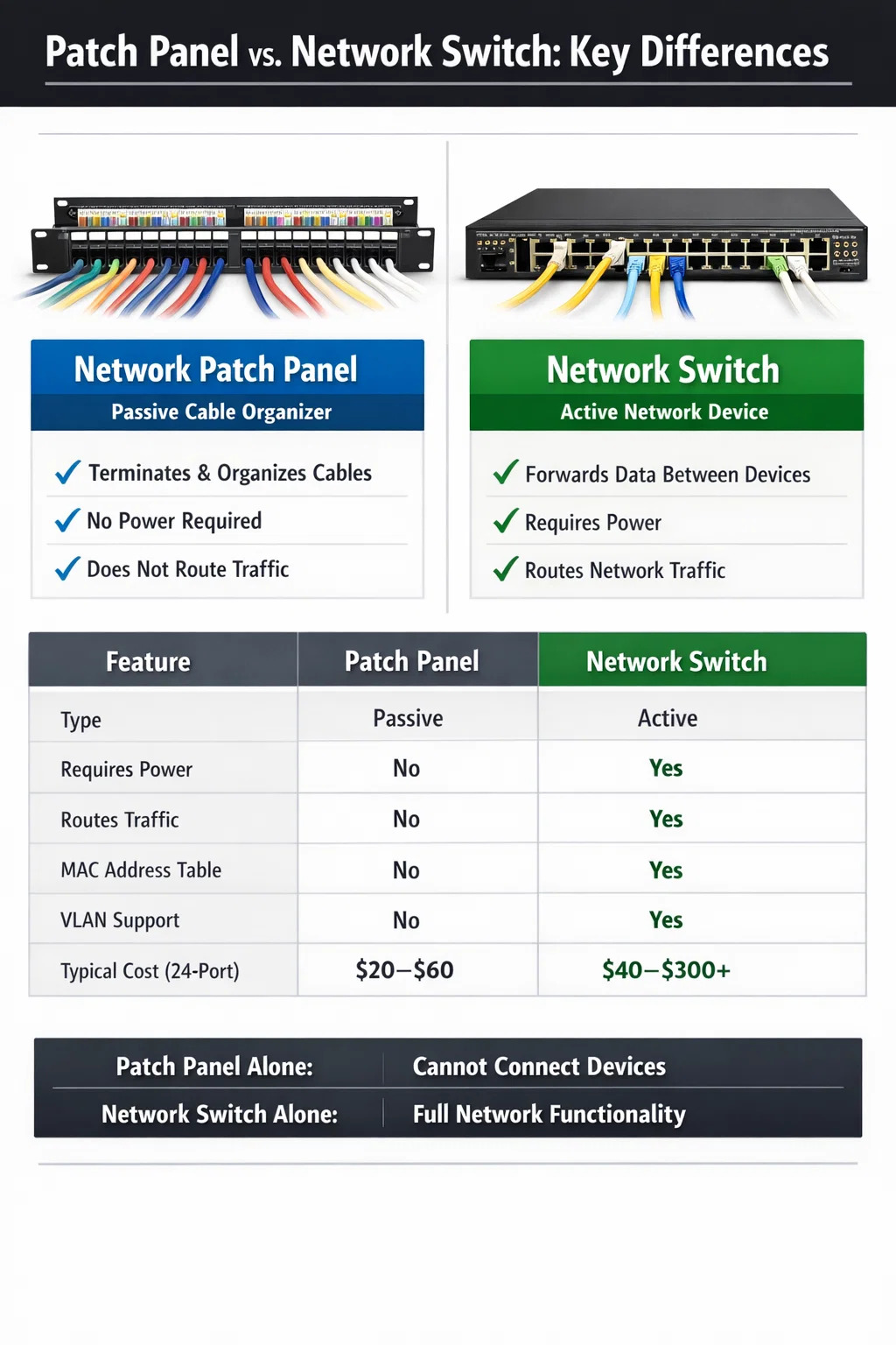 Обратите внимание на последнюю строку: коммутатор может работать без патч-панели, но патч-панель не может обеспечивать какие-либо сетевые функции без коммутатора. Это подтверждает, что если вам нужно выбрать только один, коммутатор является непередаваемым устройством.