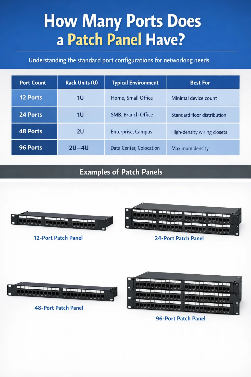 А сетевая патч-панель обычно приходит 12, 24, 48 или 96 портов , причем модели с 24 и 48 портами наиболее широко используются в коммерческих и корпоративных средах. Патч-панель на 24 порта вписывается в 1U места в стойке , а 48-портовая версия занимает 2U . Панели с 12 портами меньшего размера обычно используются в домашних условиях или компактных телекоммуникационных шкафах, а панели с 96 портами высокой плотности встречаются в крупных центрах обработки данных, где место в стойке ограничено.