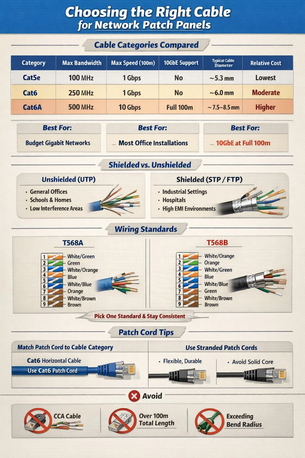 Компромисс – физический размер и вес. Кабели Cat6A значительно толще — обычно от 7,5 до 8,5 мм в диаметре по сравнению с 6 мм для Cat6 — что означает более точные расчеты заполнения кабелепровода, более тяжелые кабельные лотки и более требовательное управление радиусом изгиба. Патч-панели Cat6A также больше и дороже. Однако в центрах обработки данных, медицинских учреждениях или любой среде, где развертывается 10GbE на настольных компьютерах или периферийных коммутаторах, Cat6A является правильным выбором и явно указан в TIA-568-C.2 для приложений 10GBASE-T.
